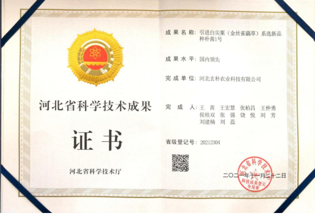 河北玄朴农业科技有限公司(市老科协玄朴农业科技创新分会)和秦皇岛市农业特色产业技术指导站共同完成的科技成果“ 引进白尖粟(金丝雀虉草)系选新品种朴茜 1号”于2021年10月29日通过了专家组的评价论证, 专家组根据调查报告结论和相关技术资料,一致认为,该研究成果选题准确,试验设计合理,技术路线可行,技术资料完整规范,符合评价要求,该成果水达到国内领先水平,并提出进一步优化配套栽培技术的建议。11月22日,河北省科学技术厅为河北玄朴农业科技有限公司颁发了国内领先的科学技术成果证书。