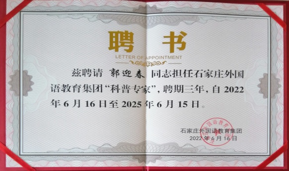 河北省老科协气象分会常务理事郭迎春被聘请为科普专家
